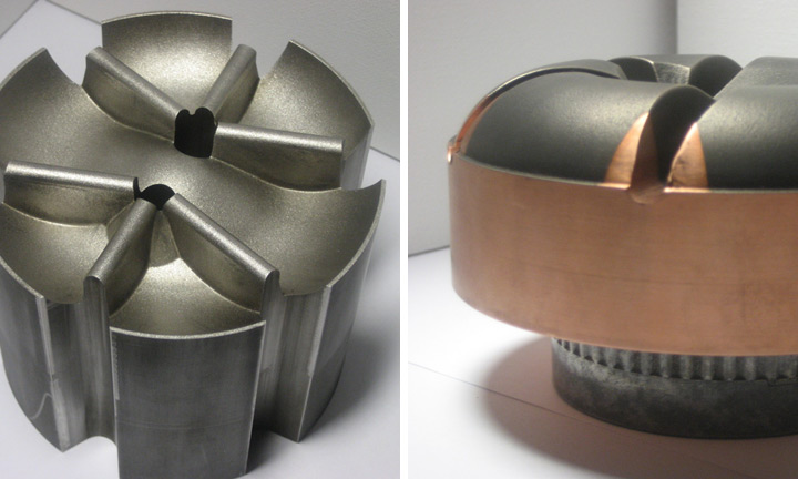 Electrode en cuivre (à gauche) et pièce en acier trempé usinée par enfonçage (à droite)